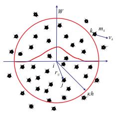 | $ \frac{{{\rm{d}}{v_i}}}{{{\rm{d}}t}} =-2\sum\limits_j {{m_j}} \frac{k}{{{n_i}}}{W_{i{j^\prime }}} + \frac{{2\mu }}{{{n_i}^2}}\sum\limits_j {\frac{{{m_j}{v_{ij}}}}{{{r_{ij}}}}\frac{{\partial {W_{ij}}}}{{\partial {r_i}}} + {\rm{g}} + \frac{{{F_i}}}{{{m_i}}}} $ | (12) |