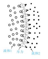 2 表面张力模型流体的宏观性质是流体分子微观运动的统计平均结果,对分子之间相互作用的具体细节并不敏感。拟颗粒是基于对流体宏观行为的连续描绘,需要对分子层次上的成对粒子间的相互作用采用粗粒化的方法进行光滑。对于流体相的内部分子,分子之间的相互作用相互抵消,从而微观作用的净力为零。由于这种作用在相界面处不能相互抵消,从而导致了表面张力的产生。对于不互溶流体来说,两相在界面处的相互作用应该可以被理解为某种形式的斥力。因此,拟颗粒中不采用在所有粒子对之间引入不同形式的引力的做法,而通过在两相界面处的不同种类粒子间引入一种斥力来实现表面张力的模拟,大大简化了表面张力模型。