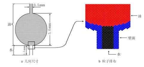 在初始时刻,假设仅洞下面的裂缝充满水,其余部分全部充满油。初始化粒子排布时,首先在一个刚好覆盖整个计算区域的矩形里按三角形排布方式填满粒子。然后,根据缝洞的构型,把边界外但距离边界在光滑函数的作用范围内(3h)的粒子指定为壁面粒子。同时,把位于水和油分布区域的粒子分别指定为水粒子和油粒子。最后,删除所有其他剩余粒子。图 3b给出了图 3a中方框部分对应的初始粒子排布,其中的水粒子、油粒子及壁面粒子分别用不同的颜色表示。