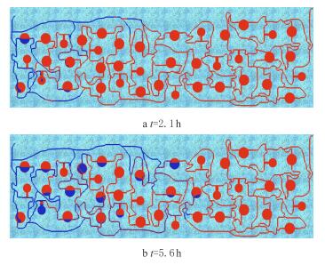 图 6是模拟过程中几个时刻的图像,其中蓝色部分代表水,红色部分代表原油,可以看出水沿裂缝向前推进,在不同的缝洞组合模式下,注入水并不能能够进入所有的溶洞,缝洞的连接点不同造成了溶洞驱替程度的不同,在溶洞顶部形成大量的剩余油,有些溶洞受大裂缝的影响,不能被水波及到,从而形成了高导流通道圈闭的剩余油。