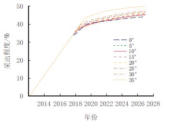 | 图1 不同倾角下的预测采出程度对比 Fig. 1 Contrast of the predicting recovery rates at differentdip angles |
