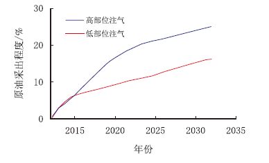 模拟结果表明(图 9),高低部位方案预测期末采收率分别为25.15%、16.46%,高部位注气效果比低部位好,提高采收率增加8.69%;高部位注气时,位于油藏腰部的井CO2 突破时间比其余井晚2 a;高部位注气时,高部位的储量动用程度也相对较高。
