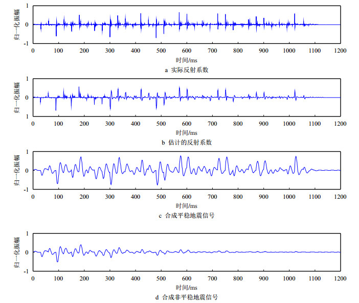 为了验证地震资料在S域中的动态反褶积处理效果,现设计一理论模型来验证该方法的有效性和正确性。理论模型中采用50 Hz的雷克子波,首先,生成随机白噪序列作为地层的反射系数(图 1a),然后,使用式(8)中的静态褶积模型得到平稳合成地震记录(图 1c),合成记录显示,地震波振幅在传播过程中满足时不变性,信号能量和波形随时间延迟不发生改变。由于静态褶积模型没有考虑到非均匀介质对地震波的吸收衰减效应,现以式(9)中的动态褶积模型为基础,利用式(14)的傅里叶反变换可得到非平稳地震记录(图 1d),在0~0.5 s,衰减函数中品质因子Q=50,在0.5~1.2 s,Q=35,随传播时间的延迟,反射波地震信号振幅逐渐衰减,该衰减地震道不仅反映了地震波在传播过程中的时变性,还能更好地刻画地震波在黏弹性介质中的衰减效应和传播特性。图 1b是基于时频域动态反褶积方法估计得到的反射系数,即为动态反褶积结果,这里式(7)中高斯窗函数参数采用σ=5,r=0.7。比较实际反射系数(图 1a)和估计反射系数(图 1b)可以看出,二者整体形态比较相似,时间起跳点较为一致,随着时间的增大,估计的反射系数形态宽度比实际反射系数形态宽度略大,这是深层地震波振幅衰减剧烈导致的,但并不影响动态反褶积的整体效果。