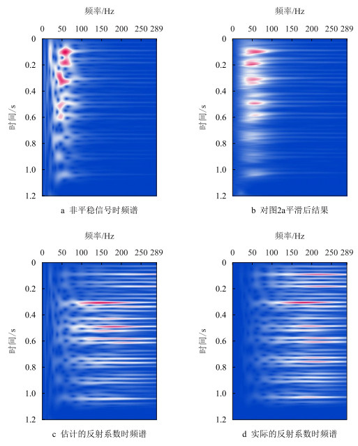 图 2展示的是合成非平稳地震信号xnonstat(t)(图 1d)基于时频域动态反褶积方法的实施过程。首先,对图 1d中的衰减地震信号做广义S正变换,然后,求得时频谱|VGSTxnonstat(τ,f)|(图 2a),该图显示衰减地震信号的主频约为50 Hz,地震信号的振幅随时间和频率的增大逐渐衰减。由于预先假定反射系数序列具有随机白噪特性,故可通过式(17)对图 2a进行谱平滑来消除地层反射系数的影响,其平滑结果即为估计的动态子波时频谱