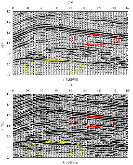 为验证广义S域动态反褶积方法在实际资料处理中的可行性和稳定性,对中国西部A地区某实际三维工区原始叠加剖面进行反褶积处理。受地层吸收衰减的影响,该区资料中、深部地震信号振幅能量较弱,如原始叠加剖面(图 3a)中红色和黄色椭圆区域所示,地震剖面特征表现为厚层少,薄层多。在未进行高分辨处理之前,原始地震资料不能有效识别目的层反射波信息。图 3b是使用本文所述方法在S域中对该原始叠加剖面进行动态反褶积处理的结果,处理前后剖面对比表明:处理后的剖面同相轴得到有效压缩,剖面的分辨率明显提高,而资料的信噪比没有明显降低,能明显刻画出薄层致密砂岩反射信息(图 3b红色椭圆区域),表现为反射波同相轴变细、增多、地层接触关系良好的特点。同时,深部地震信号能量也得到有效补偿(图 3b黄色椭圆区域),断层断点清晰可见,剖面的成层性和连续性更好。