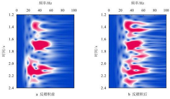 | 图5 动态反褶积前后剖面第100道信号时频谱对比 Fig. 5 The comparison of the time-frequency spectra for the 100th signal of Figure 4 before and after deconvolution |