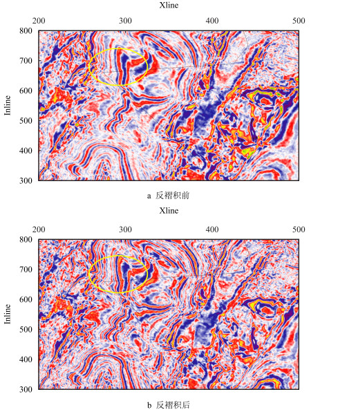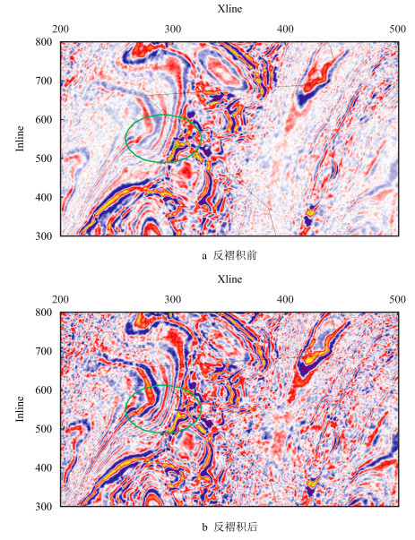 图 6a和图 7a是从三维原始资料抽取1 800 ms和2 000 ms时的时间切片,其岩性和构造特征较为杂乱,断点模糊(如图 6a黄色椭圆区域),难以直接识别和解释,地震信号能量随时间增大而逐渐衰减。对原始三维资料实施时频域动态反褶积处理,图 6b和图 7b是从处理后数据体中抽取的对应时间切片。处理前后的时间切片对比表明,处理后的资料品质明显提高,分辨率提高较大(如图 7b绿色椭圆所示区域),同时,横向连续性好,非均匀性亦清晰可辨,局部构造特征得以凸显,断点清晰可见(如图 6b中黄色椭圆区域所示),地层吸收引起的地震记录衰减能量也得到有效补偿。