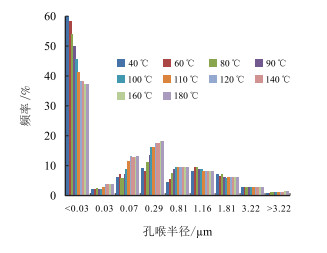 1.2 实验结果及分析图 1为同一岩芯经40~180 ℃热水作用后的毛管力曲线。由于岩芯渗透率超低,气相在离心力作用下进入岩芯的阻力明显,因此曲线中间段斜率较大,且最小湿相饱和度较高。然而,随着热水温度提高,曲线中间段逐渐平缓,并向左下方偏移,最小湿相饱和度不断减小,同一湿相饱和度对应的毛管力不断降低。但当热水温度达到120 ℃以后,各温度下的曲线几乎重合,继续升温对毛管力影响不大。由于毛管力测试均在常温于相同条件下进行,因此根据毛管力公式(pc=2σcos/r)[18]可知,其改变皆因热水对孔喉半径的影响引起。结合图 1可计算得到岩芯经不同温度热水作用后的孔喉大小及分布特征(图 2)。