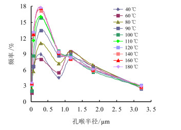 对半径在0.03~3.22 µm的孔喉分布情况单独进行分析,得到图 3。从图 3可以看到,当热水温度在40~80 ℃时,孔喉分布频率曲线呈现明显的双峰特点,峰值半径分别为0.29 µm和1.16 µm。当热水温度升高到90 ℃以后,由于更多原始半径小于0.03 µm的孔喉发生尺寸增长,因此0.20 µm处的峰值频率不断增大,直到120 ℃时达到稳定;而更多原始半径在0.03~0.81 µm孔喉的尺寸增长,又使得0.81 µm处的频率增大,1.16 µm处的频率相应减小,因此孔喉分布频率曲线转而呈现单峰特点。可见,热水温度升高可令岩芯孔喉的分选性变好。