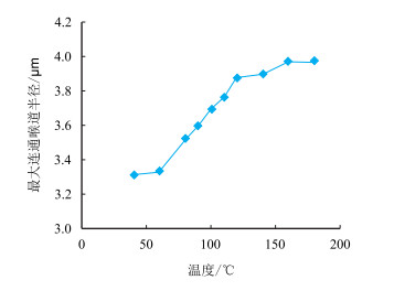 将毛管力曲线的中间段延长至含水100%,可计算得到气相开始进入岩芯的阀压,并进而获得岩芯的最大连通孔喉半径。经不同温度热水作用后的岩芯最大连通孔喉半径如图 4所示。由该图可知,随热水温度升高,岩芯的最大连通孔喉半径不断增大:当温度从40 ℃增大到180 ℃时,最大连通孔喉半径从3.31 µm增加到3.97 µm;同时,在60~120 ℃,最大连通孔喉半径的增大趋势最为明显,平均每升温10 ℃,最大连通孔喉半径增大2.7%。这一结果再次证明,热水驱温度的提高有利于微观孔隙结构的改善。