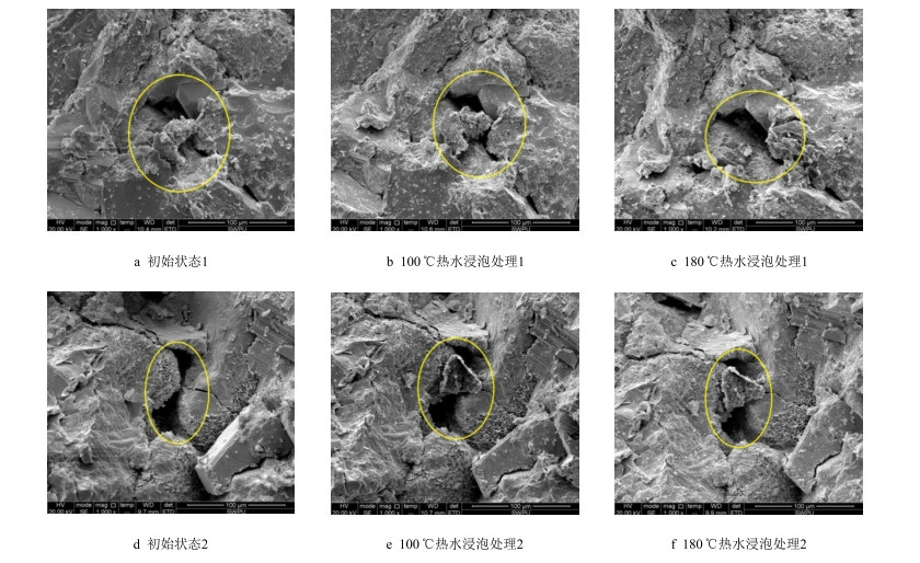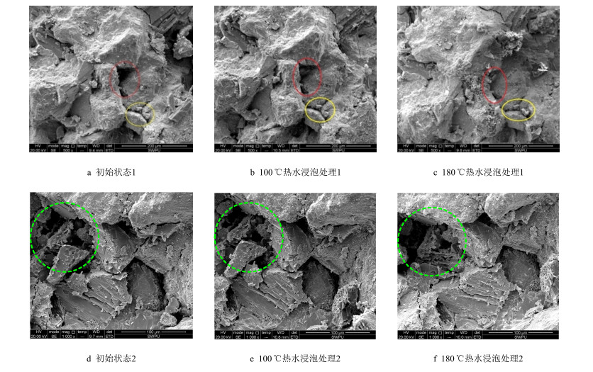 图 6展示了岩芯经不同温度热水浸泡后,同一孔喉内的微粒运移情况。从图 6a~图 6c的黄色区域可以发现,当热水温度不超过100 ℃时,孔喉空间被一微粒分隔成两部分,但当温度达到180 ℃后,该微粒消失,整个孔喉空间形成一整体。而图 6d~图 6f黄色区域内的情况则恰好相反。岩芯与热水接触后,其中一些胶结疏松的颗粒和黏土矿物会在水的浮力下处于悬浮状态;升温后,水分子热运动加剧,会带动悬浮微粒发生运移,并在烘干后呈现出位置的变化。热水驱过程中,热水的流动会增加微粒运移的几率,若其运移到狭窄喉道处,则可能产生滞留,令喉道堵塞,增大渗流阻力。超低渗油藏岩石颗粒胶结程度较高,一般不易脱落,但黏土矿物的膨胀运移不可轻视,因此在热水驱过程中需要注意黏土的防膨处理。