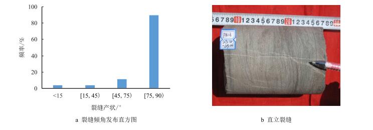 (4)裂缝倾角以75°~90°的直立缝为主,占裂缝观测总数的绝大多数%,水平缝和低角度斜交缝相对较少(图 6)。