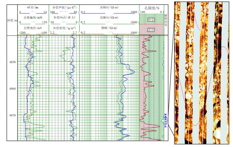 从测井识别的结果来看,取芯井的裂缝响应特征十分明显(图 8),尤其是成像测井资料,呈正弦曲线的裂缝特征一目了然。
