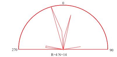 通过原理,确定了部分岩芯观测井共14条裂缝的走向,据此作出了工区裂缝走向玫瑰花图(图 9)。
