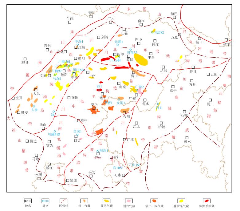 1 地质概况四川盆地位于上扬子克拉通西北缘,是扬子板块的一部分[3],印支期已具盆地雏形,后经喜马拉雅运动全面褶皱形成现今构造面貌。盆地具明显菱形边框,轮廓清晰,与周边不同构造区易于区分。根据盆地内的区域构造特征及油气分布特点,可划分出6个次一级构造带,即川西低陡构造带、川北-川东北低平构造带、川东高陡构造带、川东南低陡构造带、川南低缓构造带和川中低平构造带(图 1)。盆地具多旋回沉积特征[4],震旦纪-中三叠世为海相沉积。中三叠世末发生的印支运动导致盆地由海盆逐渐转变为陆盆,整个四川盆地堆积了上三叠统须家河组至古近系巨厚的陆相地层[5]。总厚逾万米,总体特征是西厚东薄,北厚南薄。