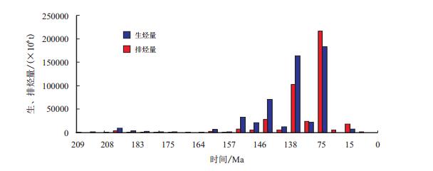 (2)四川盆地陆相烃源岩总体表现为分区演化,差异成熟,生烃期西早东晚。具有3个生烃高峰期和两个排烃高峰期。生烃高峰期分别在晚侏罗世末期(146 Ma)、早白垩世早期(138 Ma)和晚白垩世中期(75 Ma),排烃高峰期在早白垩世早期(138 Ma)和晚白垩世中期(75 Ma)。川西地区生烃高峰期在侏罗纪晚期-白垩纪中期,排烃高峰期在侏罗纪晚期-白垩纪晚期;川北-川东北地区生烃高峰期在侏罗纪晚期,排烃高峰期在侏罗纪晚期-白垩纪早期;川东南地区生、排烃高峰期均在侏罗纪晚期-白垩纪早期。