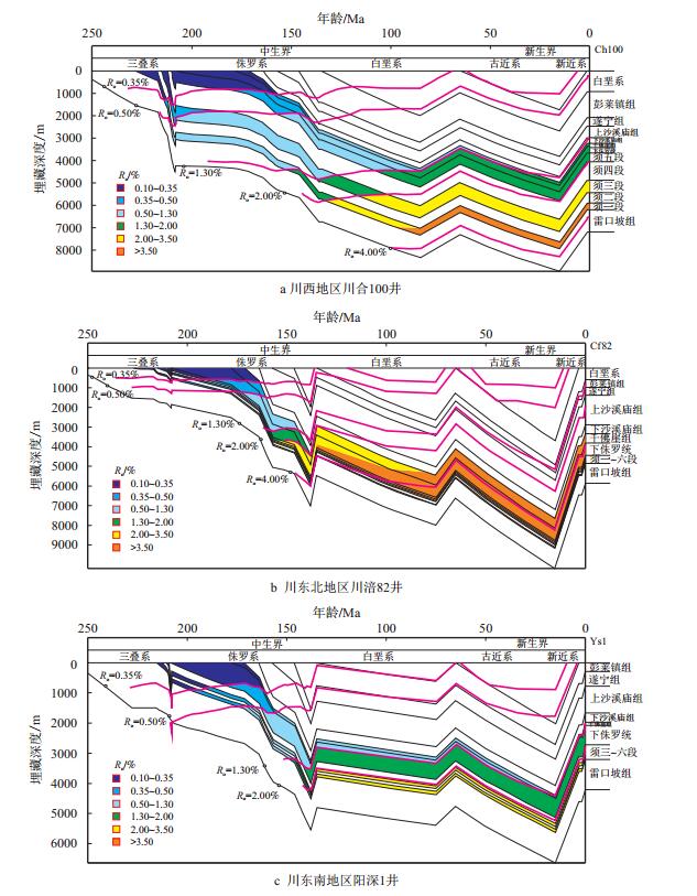 3个地区的成熟及埋藏史表明,四川盆地受印支晚期、燕山中期、燕山晚期及喜马拉雅期构造运动影响发生了4次大的构造抬升运动,总体呈现为沉降趋势,各区隆升幅度最大时期略有不同,代表了盆地内各地区不同的地质历史[16],埋深最大时期均发生在新近纪早期(图 3a,图 3b,图 3c)。盆地模拟结果表明,不同地区不同烃源岩层各自有不同的生烃高峰期。以川合100井为代表的川西地区,总体上呈现为沉降趋势,最大埋深在新近纪早期,新近纪中期隆升幅度最大。T3x1和T3x3烃源岩在三叠纪晚期Ro就达到0.5%,开始成熟生烃,至侏罗纪末期和白垩纪早期,进入高成熟阶段,达生气高峰,与前人研究认为川西上三叠统生烃高峰期在晚侏罗世[17-19]是一致的,白垩纪早、中期进入过成熟阶段。T3x5-J2q烃源岩在侏罗纪晚期至白垩纪早期Ro达到0.5%,开始成熟生烃,至白垩纪中期进入高成熟阶段,达生气高峰,T3x5烃源岩在新近纪初进入过成熟阶段,J1、J2烃源岩至今尚未达到过成熟阶段。平面上总体表现为生烃西早东晚。