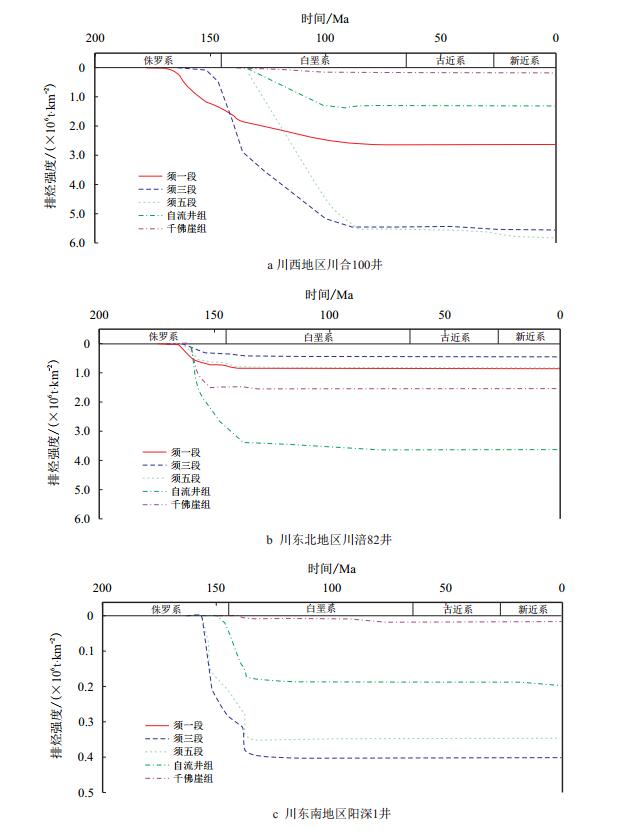 从排烃史来看,川西和川东南地区主要排烃层位是T3x,川北-川东北地区主要排烃层位是J1、J2,3个地区进入排烃高峰的时间均在侏罗纪晚期,川西地区排烃高峰期时间跨度较长,在侏罗纪晚期至白垩纪晚期,川北-川东北和川东南地区时间跨度较短,在侏罗纪晚期至白垩纪早期。
