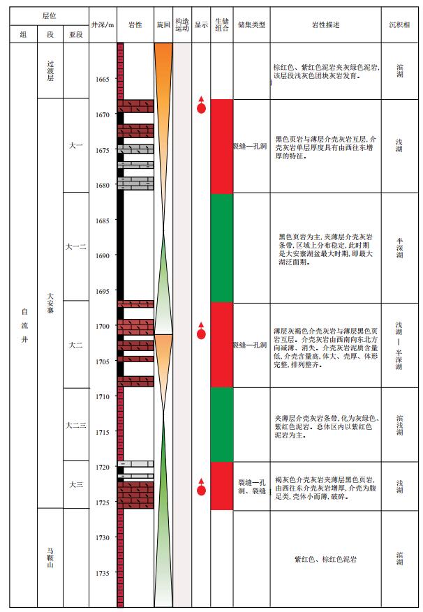 2 大安寨段地质特征桂花油田主力产油层位为下侏罗统大安寨段介壳灰岩,油层埋深由北往南变浅,埋深在1 500~2 000 m。沉积相研究表明,大安寨期桂花地区处于滨湖—浅湖沉积环境,经过湖侵、湖退形成了介壳灰岩与黑色泥页岩、紫红色泥页岩互层的特征。根据岩性组合特征、沉积旋回特征、电性特征,该区大安寨段五分特征明显,从上至下依次划分为大一、大一二、大二、大二三、大三五个亚段。其中介壳灰岩主要发育在大一、大二、大三,泥岩发育在大一二、大二三(图 1)。油层具有层薄、夹层多,成层稳定,广泛延伸的特点。桂花地区大安寨段介壳灰岩储层单层厚度为0.5~5.0 m,累计厚度为20.0~30.0 m,介壳灰岩储层普遍致密,根据已有取芯井岩芯分析表明,大安寨段介壳灰岩储层物性普遍超致密,孔隙度主要分布在1.0%~2.0%,局部发育高孔层段,岩芯平均孔隙度1.2%。根据中国不同类型储层划分的行业标准,该区储层属于致密储层。桂花背斜闭合面积10 km2,闭合度约20 m,倾角1°~2°,断层不发育,含油面积338 km2,并与西侧的蓬莱油田相连,油井具有大面积分布的特征[4-6]。