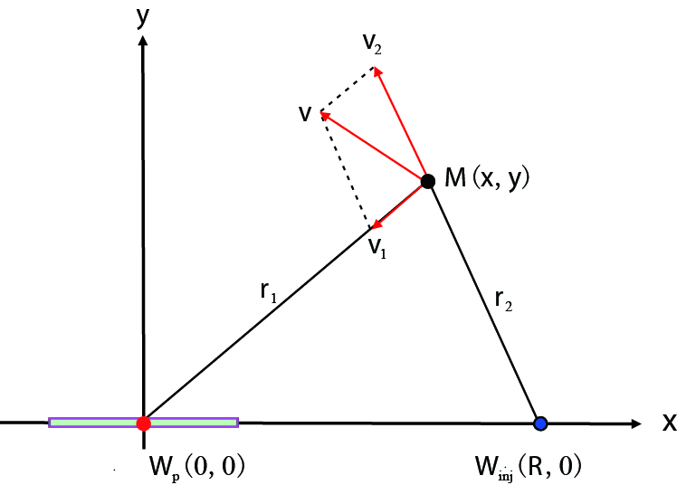 应用数学三角形相似原理及余弦定理,可得到地层中只有一口压裂油井时$M$点处产生的渗流速度大小为