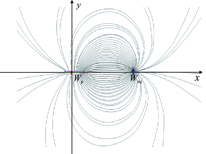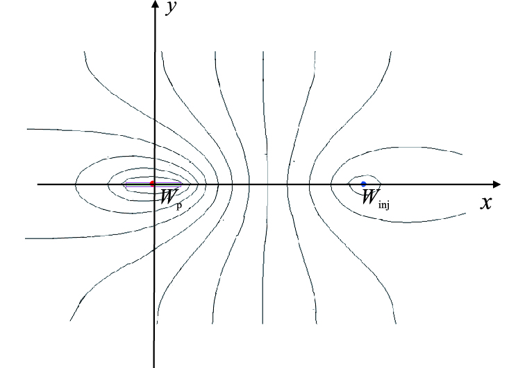 同理,若同时考虑地层中有一口压裂油井和一口水井时,