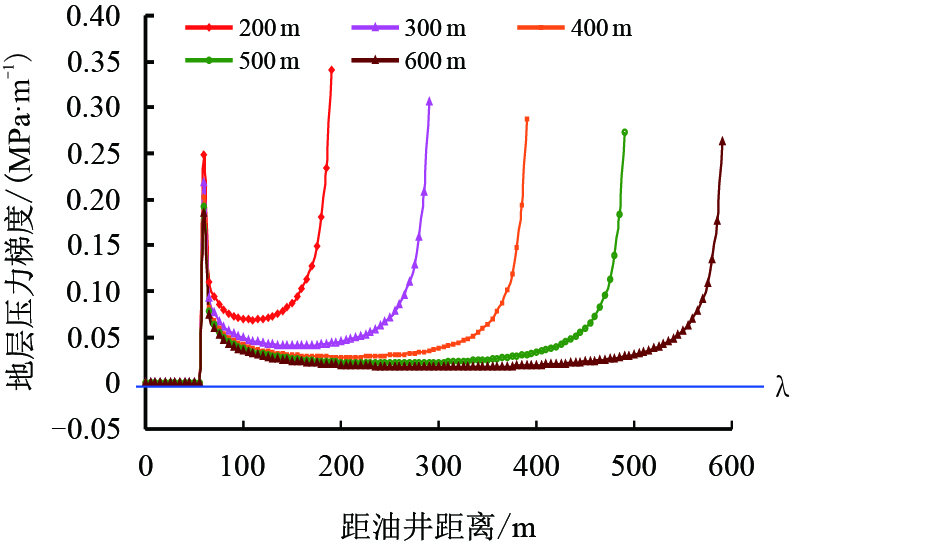 图 5为不同井距下注采井间压力梯度分布曲线,当注采压差和压裂裂缝半长相同时,随着注采井距的增大,相同位置的地层压力梯度变小,说明井距越大,克服启动压力梯度越困难。