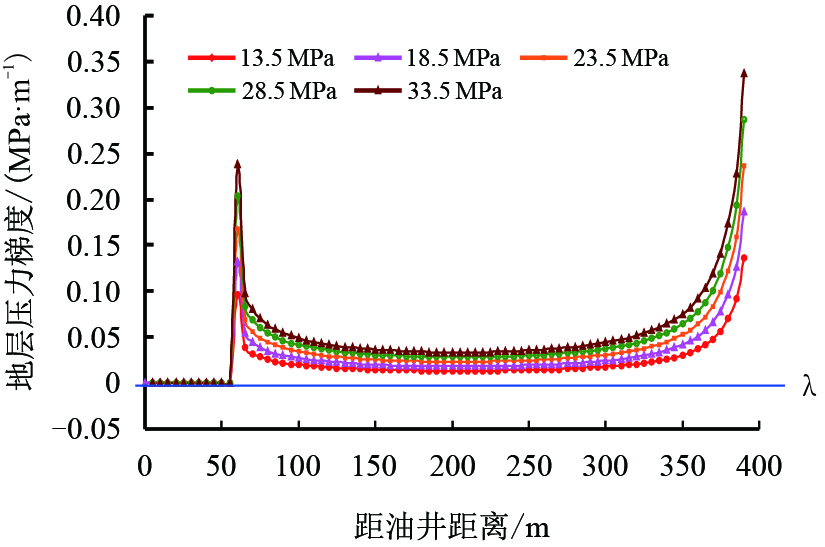 | 图5 不同井距下注采井间压力梯度分布 Fig. 5 Pressure gradient distribution between fractured producer and injector at different spacing |