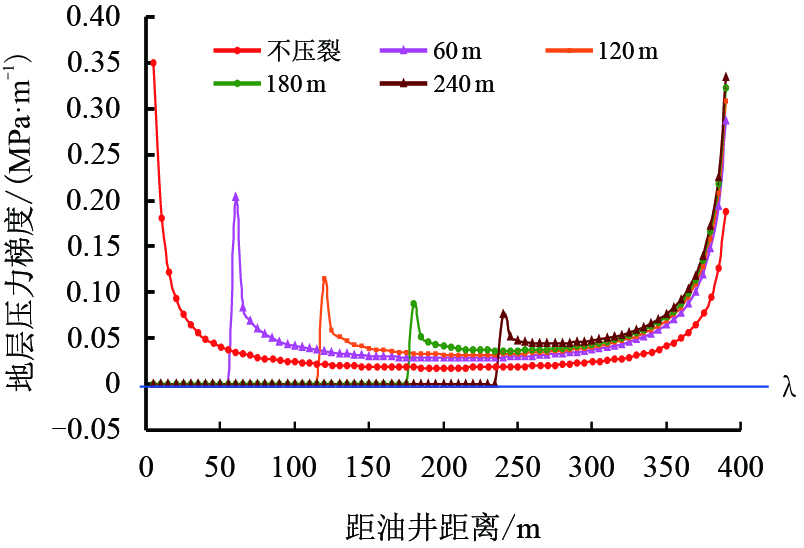 | 图7 不同裂缝半长下注采井间压力梯度分布 Fig. 7 Pressure gradient distribution between fractured producer and injector at different fracture half-length |