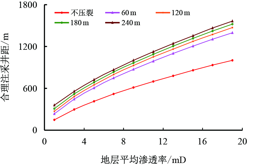 从图 8和图 9可以看出,合理注采井距随渗透率、注采压差和裂缝半长的增加而增大;与不压裂时相比,压裂措施有效提升了驱替压力梯度,明显增大了合理注采井距界限;由于地层破裂压力及设备限制,仅靠提高注采压差来增大的合理井距极为有限。因此,对实际低渗透油藏而言,采取压裂等增产措施,不仅降低了油层渗流阻力、增加地层渗透率,还能较大幅度提高合理井距。