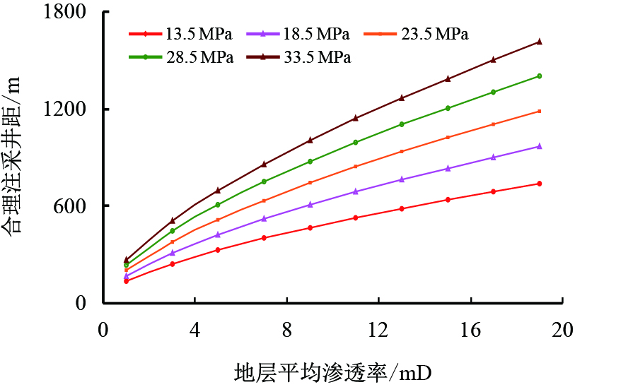 | 图9 不同渗透率和注采压差下的合理井距图版 Fig. 9 Reasonable spacing chart at different permeability and different pressure difference |