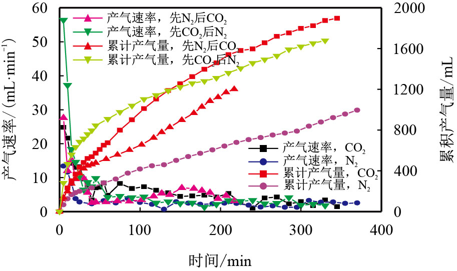 2.5 不同介质吞吐效果比较对比分析不同介质吞吐实验结果,如表 3 所示;结合不同介质的产气速率与累积产气量,如图 11所示。