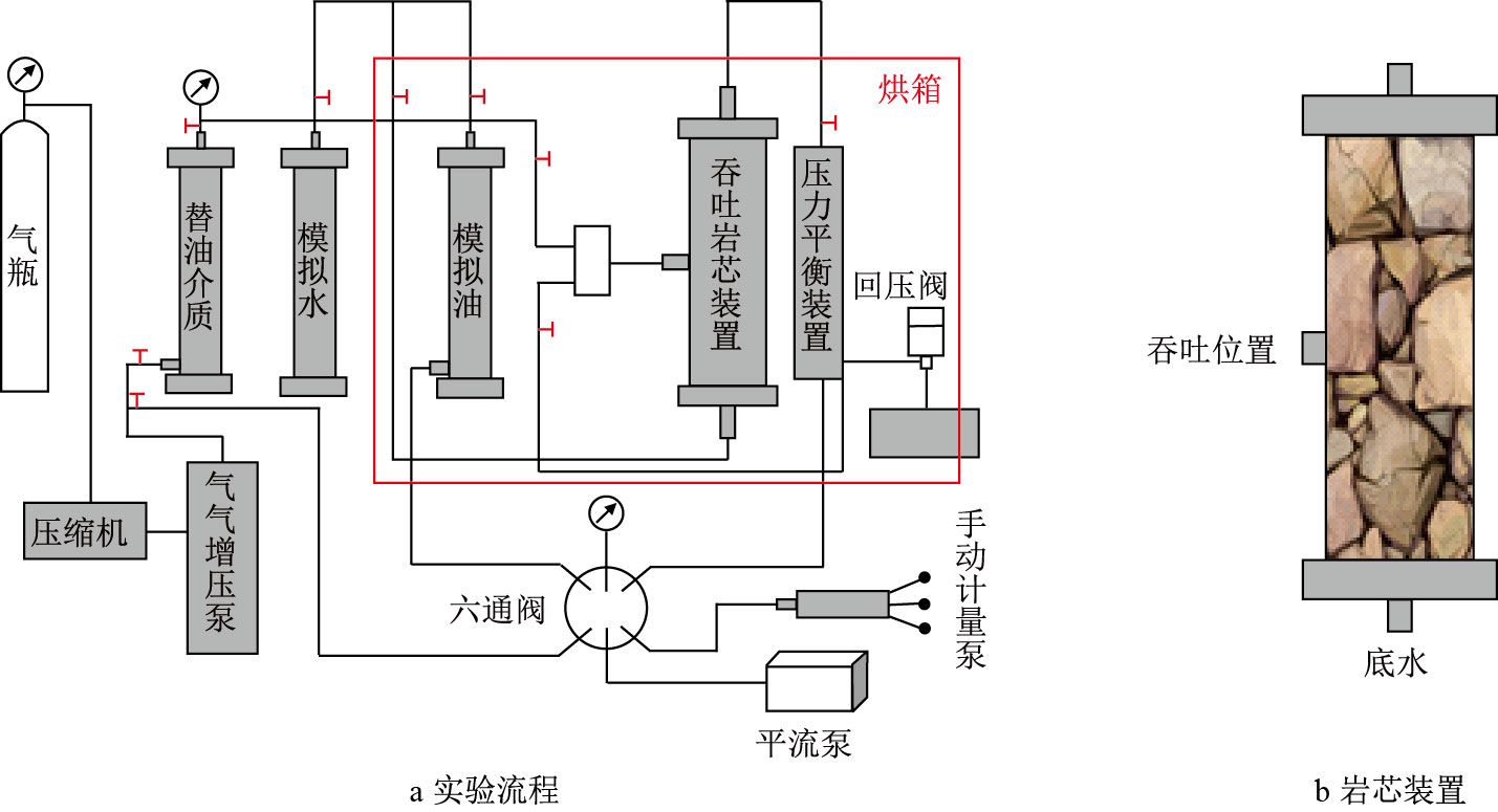 | 图2 吞吐实验模拟装置及流程示意图 Fig. 2 The experimental diagram and simulating experimental apparatus of huff-n-puff |