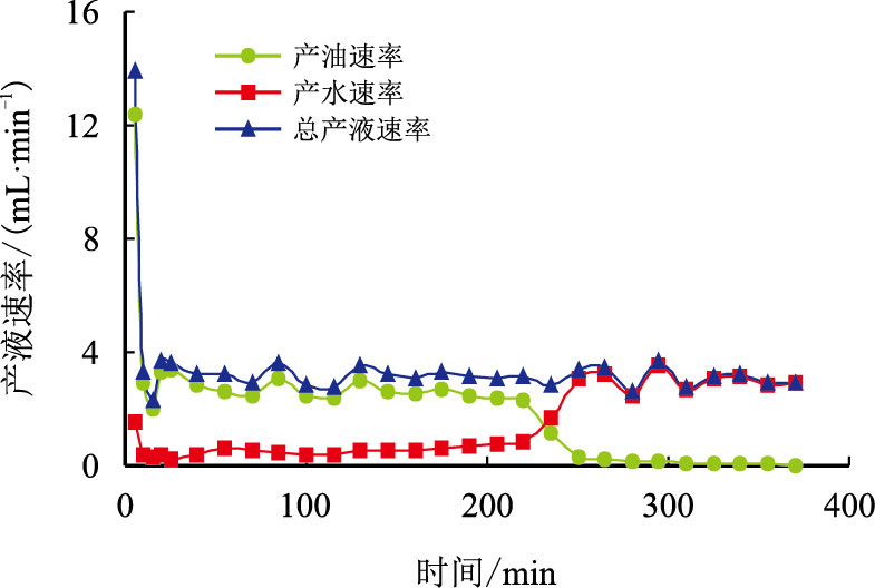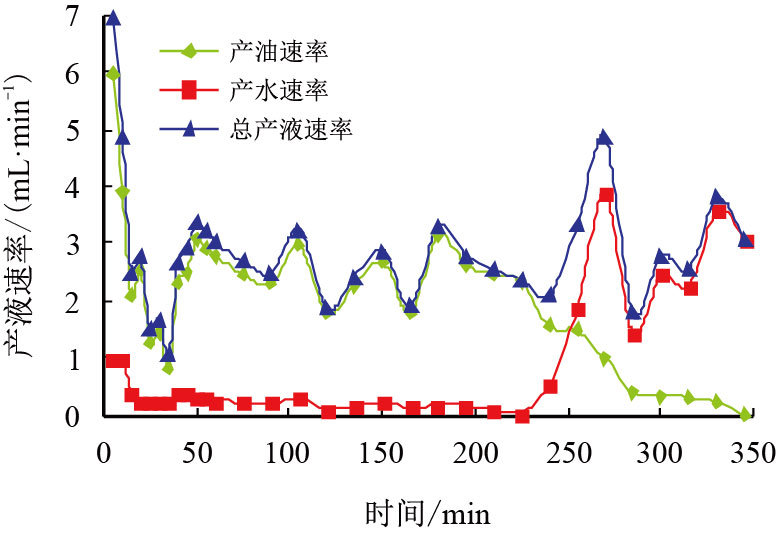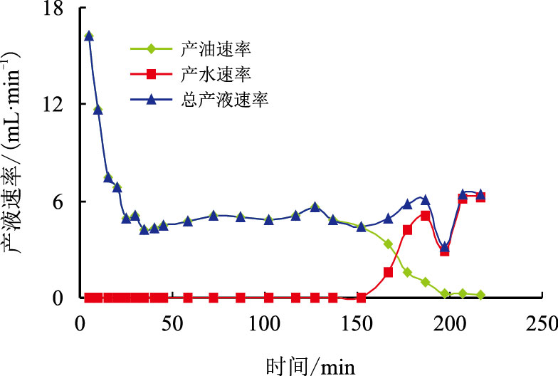 在采出时间为15 min 时,岩芯装置的压力由37.78 MPa 急剧下降到12.67 MPa,很快达到平衡。在此阶段,总产液速率由13.94 mL/min 下降到2.32 mL/min,20 min 时总产液速率回升,达到3.66 mL/min,基本与底水的注入速度3.00 mL/min达到平衡。由此,可以判断出15 min 时吞吐结束。N2 吞吐实验吞吐阶段的累积产油量为50.64 mL,吞吐采出程度为3.45%,吞吐换油率为0.422。