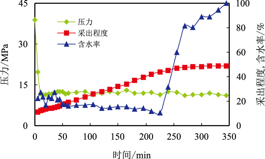 对照图 3、图 4,在采出时间为35 min 时,压力由38.78 MPa 下降到12.19 MPa,总产液速率由6.94 mL/min 下降到1.02 mL/min,40 min 时总产液速率回升达到2.66 mL/min,基本与底水的注入速度3.00 mL/min 达到平衡。由此可以判断,35 min 后吞吐过程结束。CO2 吞吐实验吞吐阶段的累积产油量为70.44 mL,吞吐采出程度为4.81%,吞吐换油率为0.587(图 4)。
