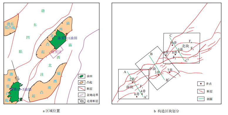 1 区域地质概况庙西北洼位于渤海东部郯庐走滑断裂东支的转折端处,是在中生代盆地基底之上发育起来的北断南超的箕状洼陷(图 1)。早第三纪郯庐断裂伸展活动强烈,使得洼陷下降盘发育近千米东营组及沙河街组,地化分析证实洼陷内东三段与沙一段具备生排烃能力。上新世后期伴随郯庐断裂的强烈活动的触发,庙西北洼陡坡带边界断裂(即庙西边界大断裂)下降盘发育了一系列呈北东东向展布的次级调节断层,形成了一大批复杂多样的断块、断鼻、断背斜型圈闭,也促进了油气从深部向浅层的运移和再分配,并最终在新近系明化镇组下段(本文简称明下段)聚集成藏。渤海湾盆地拗陷期明下期,盆地整体地形平缓、沉降缓慢、水体较浅、气候温暖潮湿[17-20]。