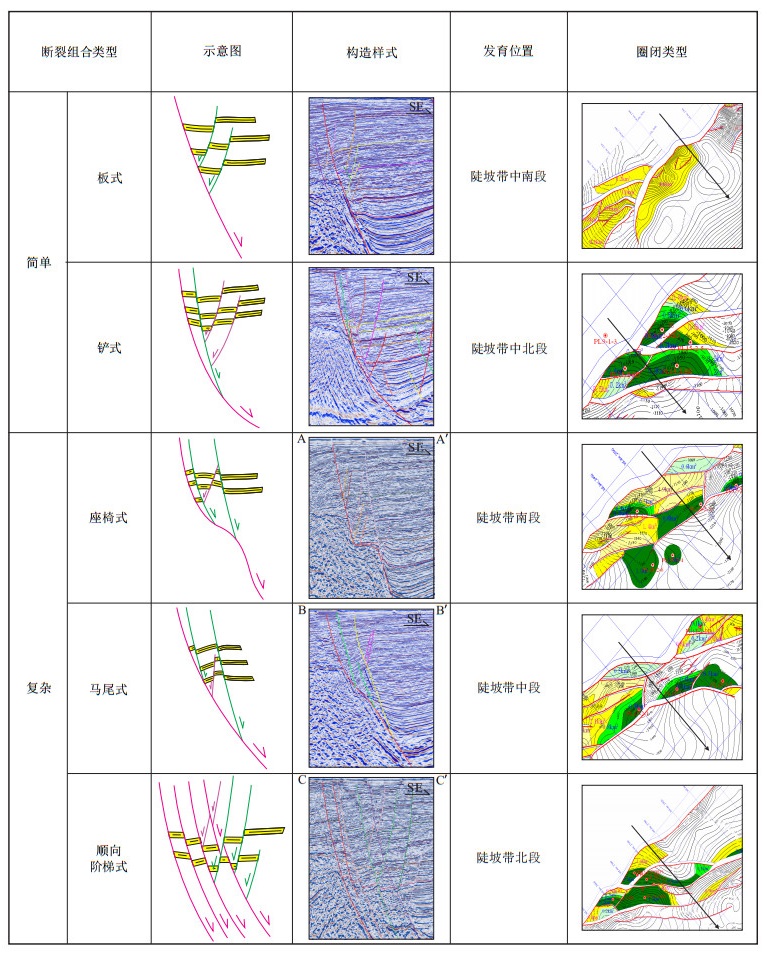 根据边界断裂平面位置断层面空间组合样式及断面倾角差异,将庙西边界大断裂由南向北划分成简单样式和复杂样式两类。其中,简单样式包括“板式”和“铲式”,复杂样式包括“座椅式”、“马尾式”和“阶梯式” 3种组合样式(图 2)。笔者着重分析研究区内发育的3种复杂断裂组合样式对油气运移、储层发育、油气成藏的差异控制作用。