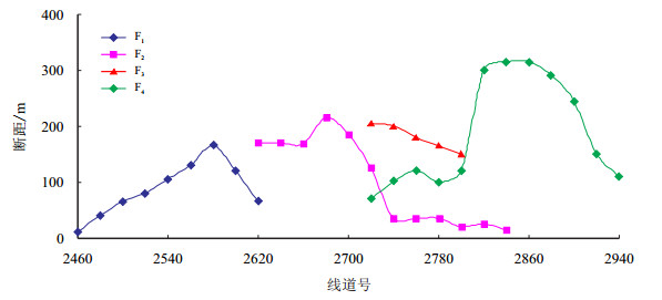 2.2 断裂活动特征庙西北洼控洼边界断裂处于郯庐断裂北东向转为北北东向的应力转换释放区域,构造区由南向北断裂性质由压扭性逐渐转变为张性。构造南块更靠近右旋走滑断裂转折端,受基底硬质潜山面限制影响,断裂组合呈座椅状,其调节断层具有一定的压扭性,而构造北块处于应力场释放区,发育“顺向阶梯式”断层组合,断裂在平面上呈撒开“羽状”的组合样式,具有断层密度大、断面产状陡、断距大的特征。从研究区由南向北各块主要调节断裂断距统计结果来看(图 3),断裂活动强度具有由北向南逐渐减弱的规律,即构造北块“顺向阶梯式”断裂较南块“座椅式”断裂晚期活动强烈。此外,从断裂的平面展布长度及垂向切穿层位判断,北块晚期断裂活动持续时间较南块更长。