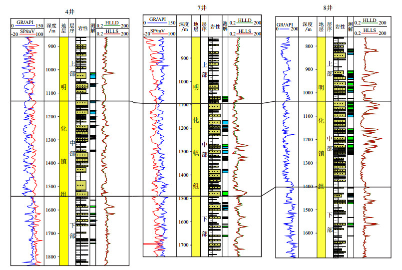 3.1.3 明下段储层叠置样式差异特征钻井资料证实,构造区明下段砂岩百分含量为40.0%~60.0%(图 4),属极富砂型浅水三角洲沉积。砂岩岩性以灰色、灰黑色细粉砂-中细砂岩为主,分选较好,磨圆为次棱-次圆状,发育交错层理、水平层理等,单层厚度在5.0~15.0 m,最大厚度25.0 m。泥岩单层厚度一般小于10.0 m,最大厚度20.0 m。明下期古生物孢粉组合以发育“粗肋孢属-伏平粉属-枫香粉属组合”为特征,发育呈棕红色-灰绿色浅水三角洲-滨浅湖支流间湾泥岩,反映了亚热带气候半氧化-半还原的极浅水沉积环境。