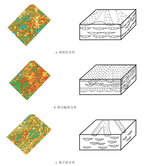 根据明下期基准面旋回变化差异,明下段各沉积期储层发育规律及砂体叠置方式存在以下特征:(1)明下段下部处于高水位沉积期,发育水下分流河道砂体,在平面上以“孤立分支状”展布。钻井揭示岩性组合呈厚泥夹薄砂的沉积序列,砂岩百分含量22.6%~35.0%,单层砂岩厚度在0.5~5.5 m,泥岩质纯呈浅灰色灰绿色,单层最大厚度27.0 m,砂体彼此连通性差,单一水道宽度在50~200 m(图 5a)。(2)明下段中部基准面逐渐开始下降,三角洲向湖推进距离增加,水下分流河道砂体可推进至盆地中心位置。由于基准面下降,水体较浅,可容纳空间减小,河道频繁摆动互相切叠,发育以相互切割的“拼合板状”水下分流河道储层为主,砂岩百分含量可达50.0%~65.0%。单层砂体厚度可达40.0 m,砂体彼此联通性好,平面展布稳定(图 5b)。(3)明下段上部基准面开始缓慢上升,受湖浪频繁改造作用影响,先期沉积的水下分流河道、河口坝沉积易发生弱席状片状化,砂岩厚度普遍较薄,砂岩百分含量34.6%~45.0%,单层砂岩最大厚度在15.0 m。席状砂特征明显(图 5c)。