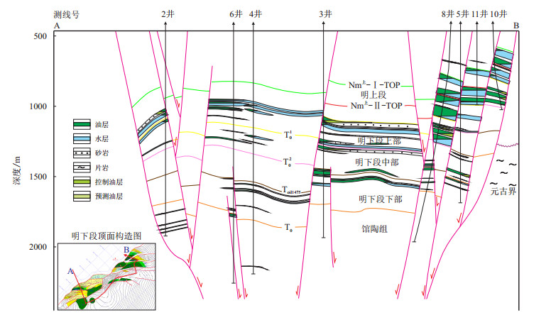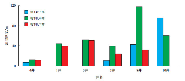 3.3 油气差异成藏特征综合研究区不同构造位置断裂组合模式、断裂活动强度以及储层条件的差异,导致构造区由南而北各块油气差异成藏特征明显。构造区已钻井揭示的南向北油藏剖面图(图 6)直观地反映了构造区油气南北差异成藏规律,表现为油气成藏层位具有由南向北逐渐抬高的趋势,油层厚度、油藏幅度由南向北逐渐增大的特征(图 7)。