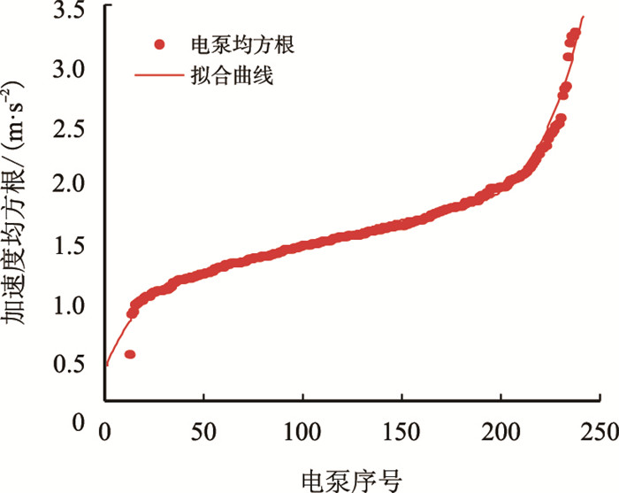 将潜油电泵的三维振动信息进行合成,并将一段时间内的振动用均方根表示,每一节泵的振动强度用一个合成均方根数值ARMS作为代表,所以数据类型为一维。K-means算法是根据数据密度进行分类的,数据密度即数据之间的关联程度。如果将ARMS按由小到大的顺序排列并以其电泵序号为横坐标,如图 5所示,则数据密度就转化成了曲线斜率,且数据密度与曲线斜率成反比。为此,对离散点进行多项式拟合,用拟合曲线近似代表待分类数据,以便确定最优的初始聚类中心。