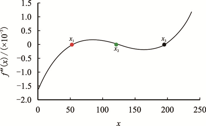 根据K-means算法的分类依据,聚类的边界就是数据密度发生明显变化处,也就是斜率明显变化处,也就是曲线的拐点。根据数据的特征以及装配质量划分成4个等级的要求,拟合曲线f(