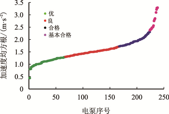 (3) 合成振动加速度均方根小于1.30 m/s2的潜油电泵为优质电泵,使用寿命最长,宜用于高产井;处于1.30~1.72 m/s2的为质量良好电泵,使用寿命较长,可正常使用;处于1.72~2.35 m/s2的为质量合格电泵,使用寿命一般,应谨慎使用;大于2.35m/s2为质量较差电泵,使用寿命较短,应维修后再使用。