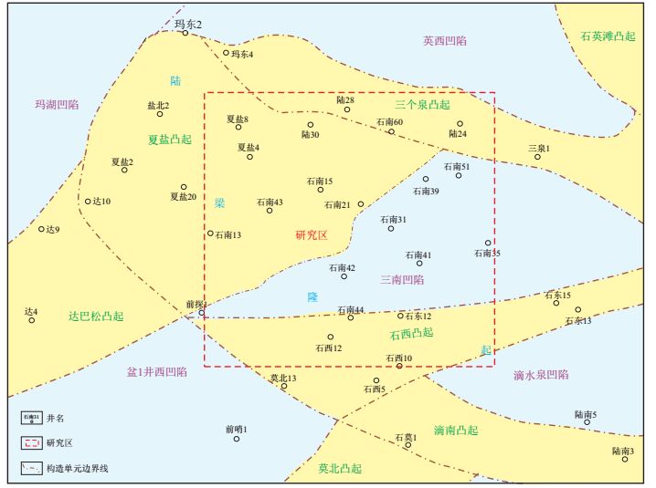 1 地质概况陆西地区,即陆梁隆起西部区域,地理上处于准噶尔盆地腹部古尔班通古特沙漠腹地。构造上北靠英西凹陷,西邻玛湖凹陷,南接盆1井西凹陷,东靠滴水泉凹陷(图 1)。清水河期盆地整体向南掀倾,车莫古隆起埋藏逐渐消亡,自南向北湖侵,整体处于准平原化阶段[1]。清水河组(K
