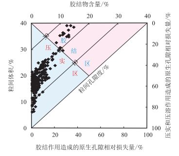 | 图12 清水河组一段压实/胶结减孔交会图 Fig. 12 Intersection graph of compression pore decreasing member and cementation pore decreasing member |