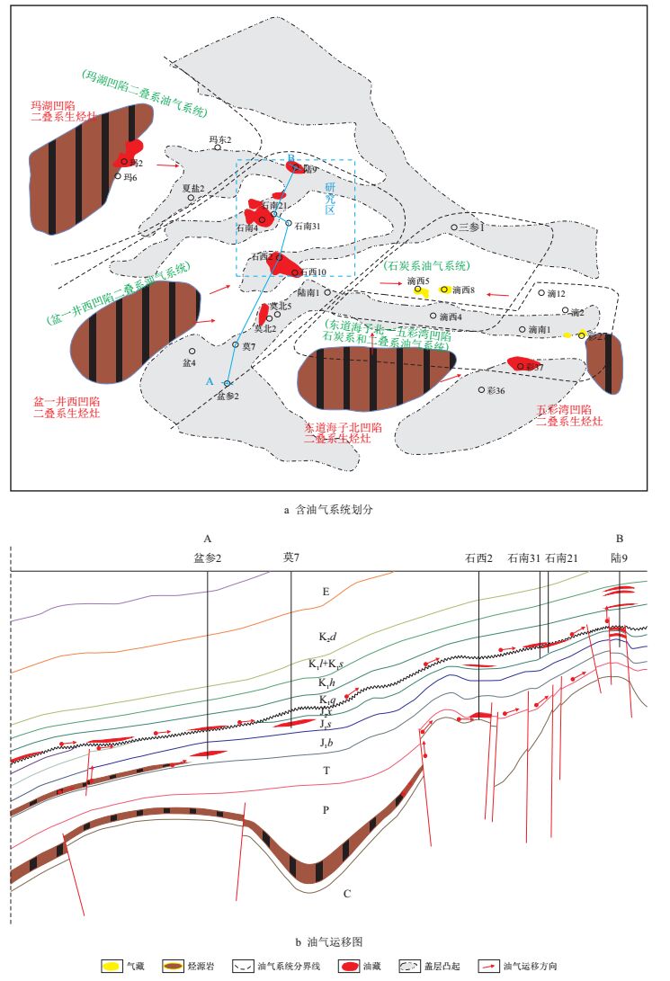 | 图13 准噶尔盆地腹部含油气系统划分及油气运移图 Fig. 13 Oil and gas system division and migration diagram of central Junggar Basin |