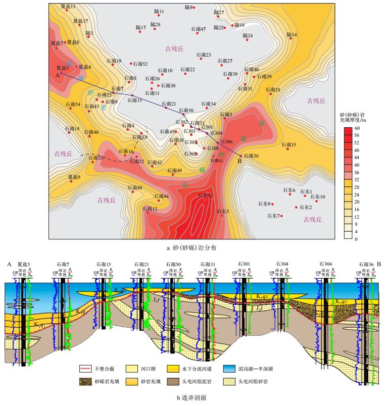 陆西地区清水河组一段连片沉积的砂(砂砾)岩主要为低位体系域辫状河流相沉积,沉积受控于白垩系沉积前沟谷地貌[5-10]。砂砾(砂)岩沿两沟展布,南部深洼处沉积厚度大。石南清水河期发育NE向砂砾岩及NW向砂岩两个物源体系。北西方向物源体系下清水河组底部沉积一套中细砂—中粗砂岩,北东方向物源体系下清水河组底部发育一套砂砾岩沉积,北东方向物源供给能力强于北西物源。砂(砂砾)岩储层约占整个地层的30%左右,最厚能达60 m(图 2)。