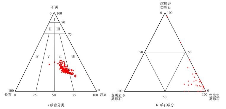 | 图3 清水河组砂岩分类和砾石成分三角图 Fig. 3 Structure and location map of Shinan area |
