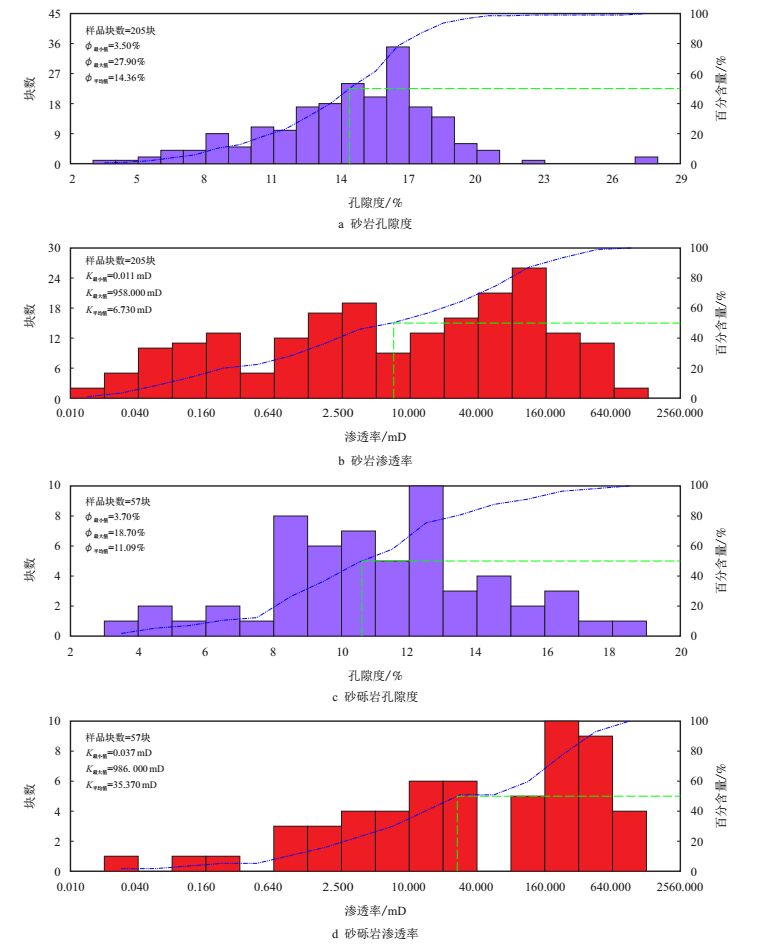 | 图6 清水河组一段孔隙度和渗透率直方图 Fig. 6 Histogram of porosity and permeability histogram of Member 1 of Qingshuihe Formation |