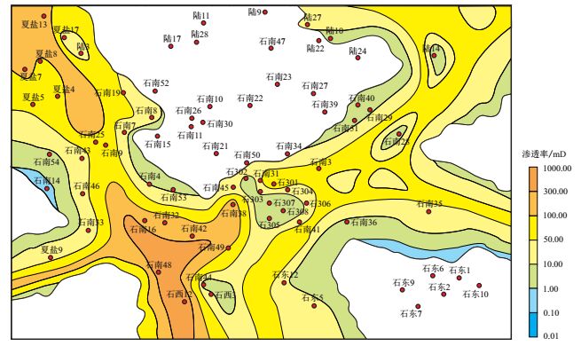 | 图8 清水河组一段储层渗透率平面分布 Fig. 8 Permeability plane distribution of Member 1 of Qingshuihe Formation |